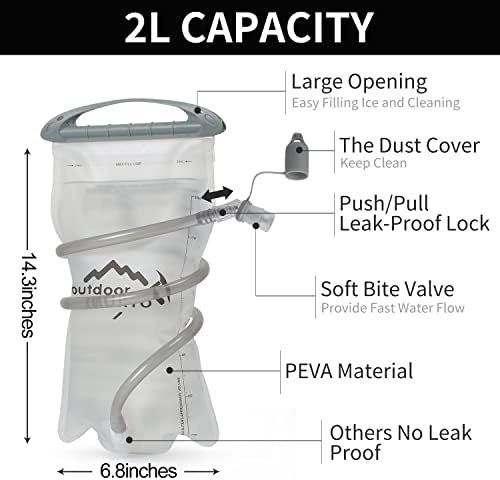 - 🚴【Premium Quality Water Bladder】The Hydration Pack Backpack comes with a 2 liter hydration water bladder and two 250ml soft flask. A switch valve and a cover cap make double leak-proof. Large opening allows quick filling of water and ice and it is easy to clean, the water line (40"length,0.4"diameter) provides a wholesome flow for easy drinking keeps your water tasting fresh, all day. The water temperature is range -20~+50℃.
