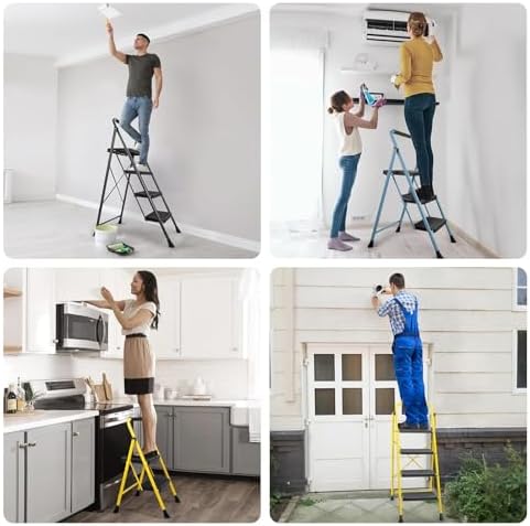 - [WIDE APPLICATIONS] Our step stools for adults foldable are perfect for a wide range of tasks, from changing light bulbs and reaching high shelves to painting and decorating your home. The folding stools for adults portable are suitable for both indoor and outdoor use, making it the perfect addition to your home, garage, Closet, Library, or workplace.