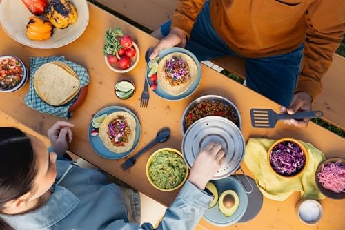 - Versatile Cookware: The set includes a stainless steel lid with vent and strain holes, a nonslip cutting board with a removable silicone trivet, two 7-inch (17.7 cm) stacking high-walled plates, two dual-end sporks, and a 2-piece spatula, offering versatility for various outdoor cooking needs.