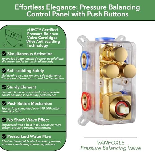 - Certified Anti-Scalding Shower Valve and Safe Shower System: This shower system is made with your family’s safety in mind. Equipped with a cUPC certified pressure balance shower head valve, it ensures quality, longevity, and prevents burns due to sudden fluctuations in hot or cold water temperature.