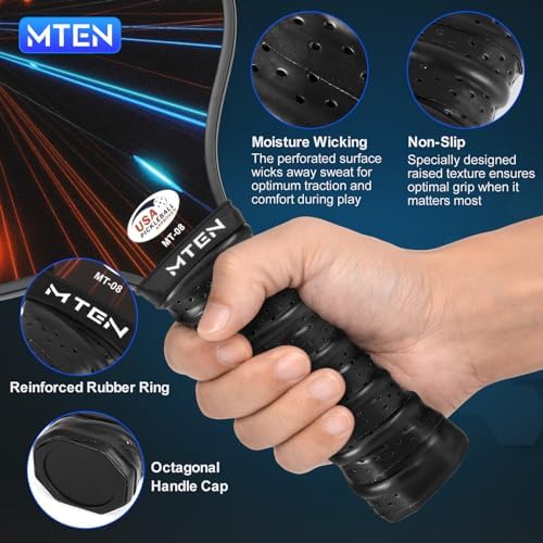 - Comfortable Ergonomic Grip: Pickle ball set is designed to be perforated, sweat absorbent, and cushioned. It can help users better grasp the grip and provide cushioning. 4.57" grip circumference allows enough room for maximum wrist snap for power and spin and range of motion in your wrist