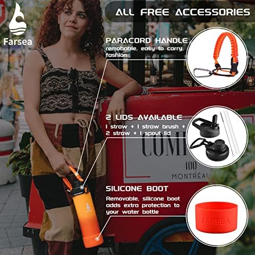 - WHAT YOU'LL GET: Farsea is committed to providing the best value and highest quality to the customers; We offer Continuous After-sales Service and Solve All Problems; We offer several different capacity bottles(12 oz, 18oz, 24 oz, 32 oz, 40oz) and you can choose according to your needs; Package: Comes with 2 lids (Straw lid & Spout Lid), paracord holder, protective Silicone Boot, nice packing box, 2 straws, and straw brush