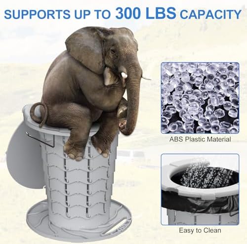 - STURDY & DURABLE MATERIAL: The side panels of porta potty travel toilet is made of modified ABS plastic material with 70 latches and non-slip bases for stability. Its extremely portable design makes it the best camping potty, offering home comfort in a compact, washable, and sturdy form that can support up to 300 LBS. Our travel potty for adults comes with a waterproof handy bag for easy storage and transport and comes with two roll toilet bags.