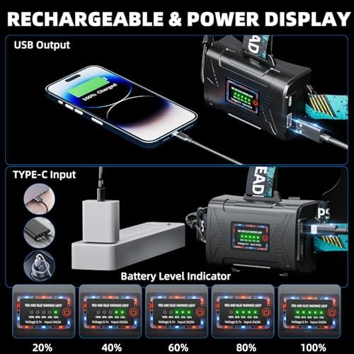 - 【Back Warning Light】Led Headlamp includes a built-in red & blue warning lights, ensuring you remain visible to others in low-light conditions, perfect for runners, cyclists, and outdoor workers. Headlamp has 5 LED battery level indicators offer accurate power monitoring, prompting timely recharging. In emergency situations, the rear warning light can provide a signal to alert others, making it easier to locate someone in distress.