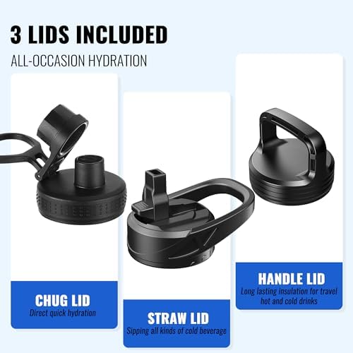 - 3 LIDS LEAKPROOF DESIGN: The 32 oz water bottle with straw is equipped with 3 individual wide-mouth lids to serve all hydration needs, Sip hot drinks, all caps allow for easy one-handed or hands-free sipping when you are busy or on-the-go