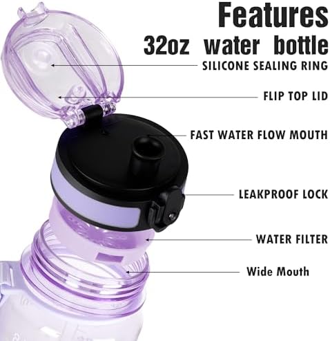 OLDLEY Water Bottle, 32oz Motivational Sports Water Bottle with Time Marker - Times to Drink - Tritan, BPA Free, Wide Mouth Leakproof,Amethyst (1 Bottle)