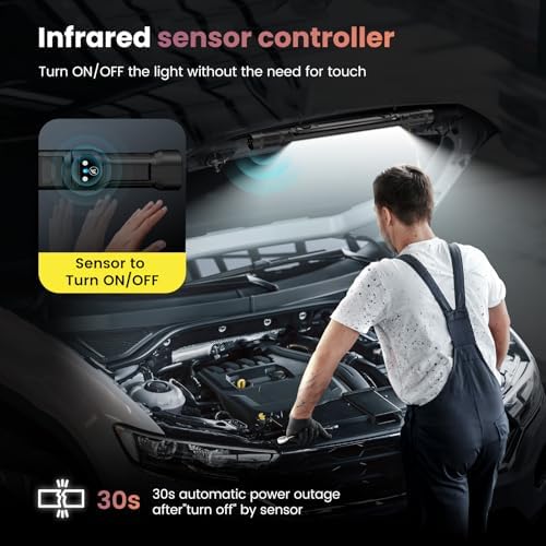 - 👋【𝐒𝐞𝐧𝐬𝐨𝐫 𝐂𝐨𝐧𝐭𝐫𝐨𝐥】This underhood work light features an infrared sensor, adding even greater convenience and practicality. While you're working, you can effortlessly toggle the light on and off without the need to physically press any buttons. When you need to momentarily step away or take a break, it provides you with added convenience while also conserving more power, making it even more environmentally friendly.