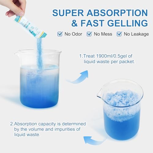 - 【Easy to Use】Simply place a portable toilet bag in a bin and choose your preferred method: add the gel first or pour in liquid waste first, then wait just 1-2 minutes for rapid solidification. Each individually packed 10g pouch (60 packs included) treats 0.5 gallon (1900ml) of liquid, adapting to your desired consistency - add more gel for firmer results. Compact, pre-measured, and mess-free, this gel ensures quick, eco-conscious waste management so you can focus on adventure - not cleanup