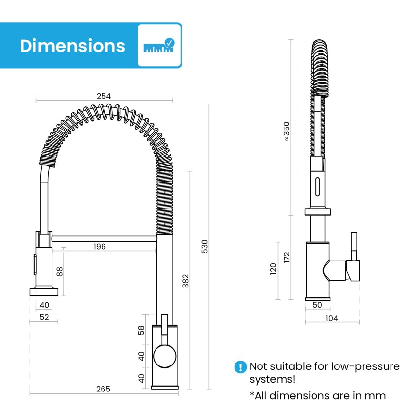 - Complete set tested – the high-pressure sink faucet comes with all accessories, assembly instructions and 2 DVGW-certified connection hoses (length 60 cm) and can be attached in no time with the included mounting kit