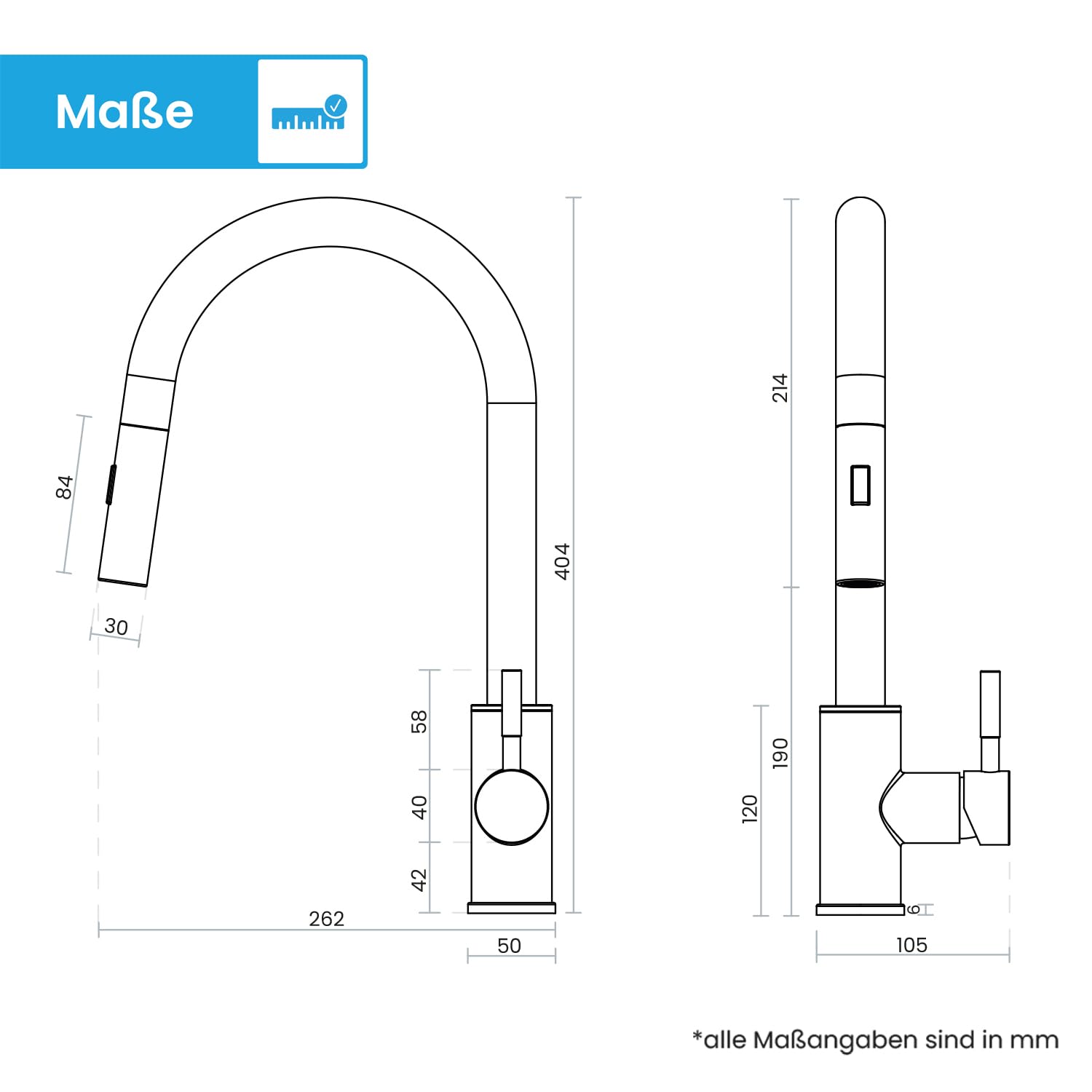 Bächlein Kitchen tap 360° rotatable (matt black) – single-hand basin tap made of stainless steel with pull-out hose and spray head with switch knob, tap for the kitchen