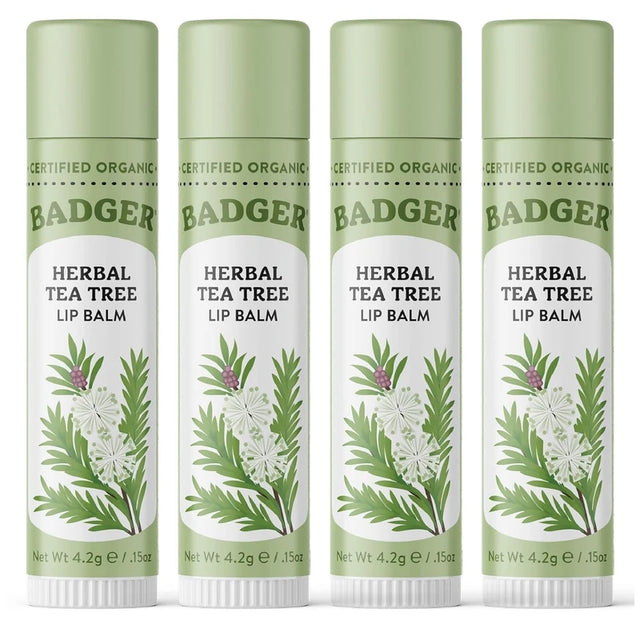 Badger - Herbal Lip Balm, Tea Tree & Lemon, Certified Organic Lip Balm, Fair Trade, Herbal Lip Care, 0.15 oz (4 Pack)