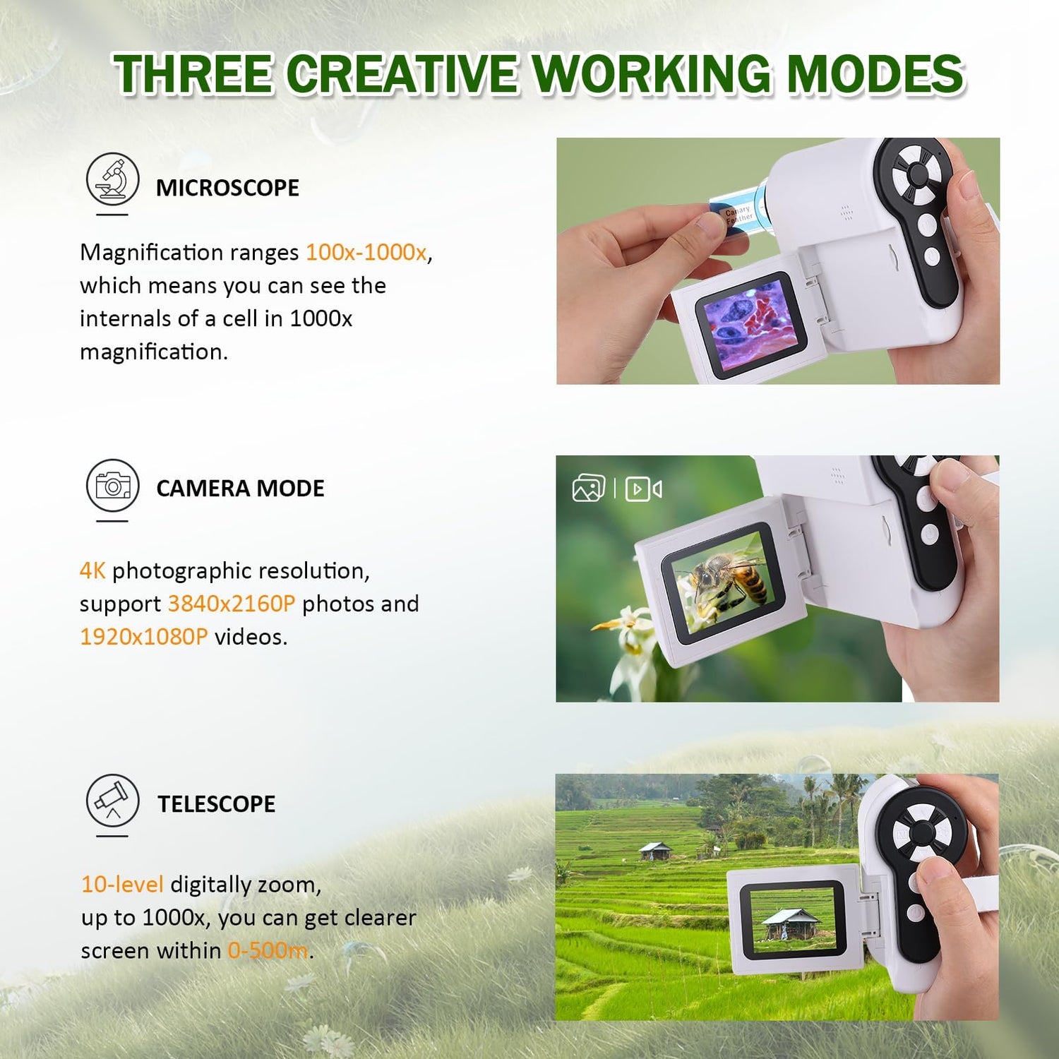 - ๐ฏ-๐๐ป-๐ญ ๐๐ฒ๐๐ถ๐ด๐ป: 1) Microscope Searching, 2) One-Click Photo & Video Recording, 3) Telescope, choose what you want to enhance child's learning experience. And this digital microscope made of 4K resolution, provides much higher clarity
