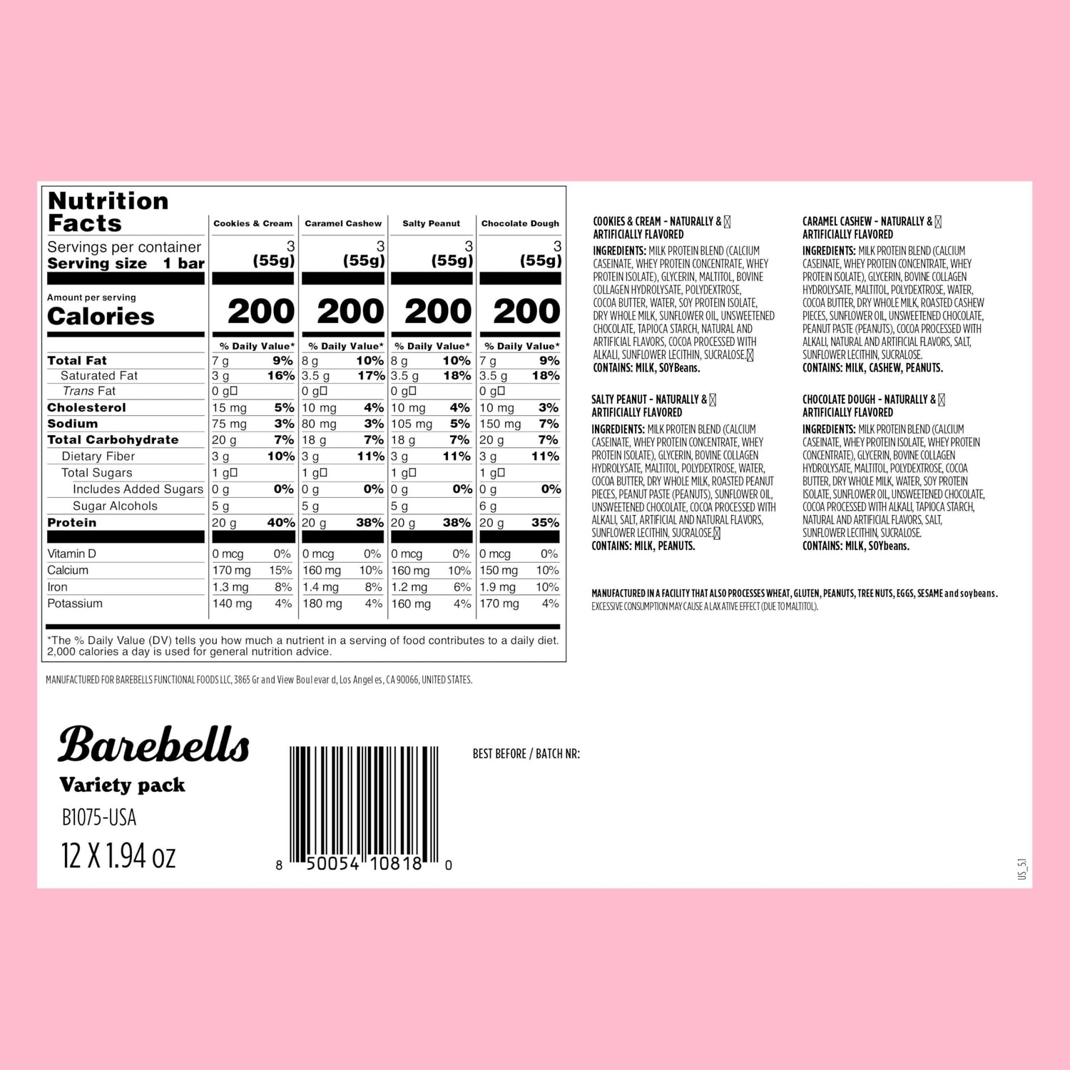 - BAREBELLS VARIETY PACK PROTEIN BARS - 12 individual yummy Barebells protein bars (Pack of 2)! Tired of eating bars that taste like cardboard? Our protein bar variety pack is a delicious mix of some of our fan favorite flavors, all with 20 grams of protein – (3) Cookies & Cream, (3) Caramel Cashew, (3) Salty Peanut, and (3) Chocolate Dough.