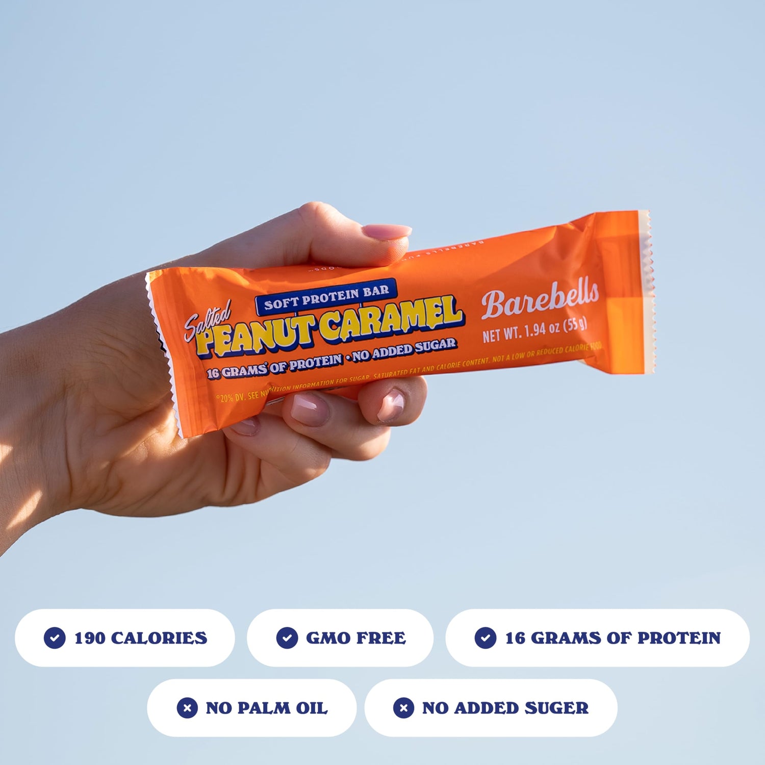 - BAREBELLS SOFT PROTEIN BAR SALTED PEANUT CARAMEL (PACK OF 2) - 24 individual fluffy Barebells protein bars! Super soft chocolate filling, mixed with a salted peanut crunch, topped with a sweet caramel layer and silky soft chocolate shell. Our soft protein bars have 16 grams of protein and no added sugar*!