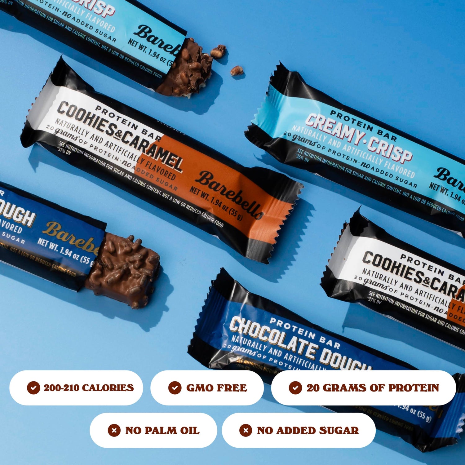 - BAREBELLS STARTER PACK (3 PACKS OF 12) – New to Barebells or just love the classics? This mix pack includes 12 Chocolate Dough, 12 Creamy Crisp, and 12 Cookies and Caramel protein bars—three of our most-loved flavors. From rich brownie indulgence to creamy cookie crunch and a touch of sweet and salty, this trio has a little something for everyone. With 20 grams of protein and no added sugar*, it’s the perfect way to get started—or to keep your go-to favorites on hand.