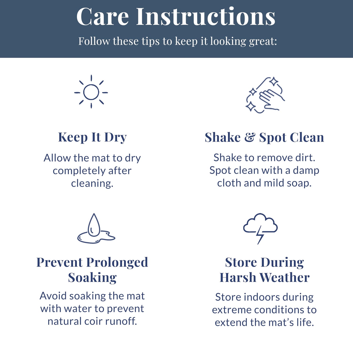 - Made of Durable Coir - Crafted from 100% natural coconut coir fibers, one of the strongest and most durable plant-based materials. Light shedding is normal with all natural coir mats. When wet, coir fibers may release natural color, which can stain floors or surfaces. This is a natural property of coir. For best results, use a protective undermat, allow the mat to dry fully after rain, and place in a covered entryway or on a covered porch.