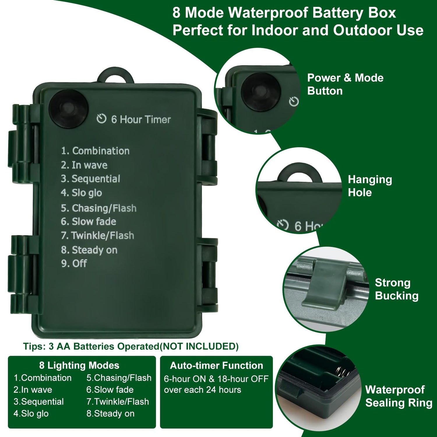 Details: General Specifications:* Light color: Warm White* Wire color: Green* Battery: 3 x AA size 4.5 V (Battery Not Included)* LED quantity: 100pcs, 100 LED at 10cm/3.94in spacing* Total Cable Length: 10m/33ft* Time Control Function : 8 modes with a time control function 6 hours "ON" and 18 hours "OFF"* Weatherproof: IP44, can be used for outdoorPackage List:* 2 x Battery String Lights 33FT* 2 x 3AA Battery Box