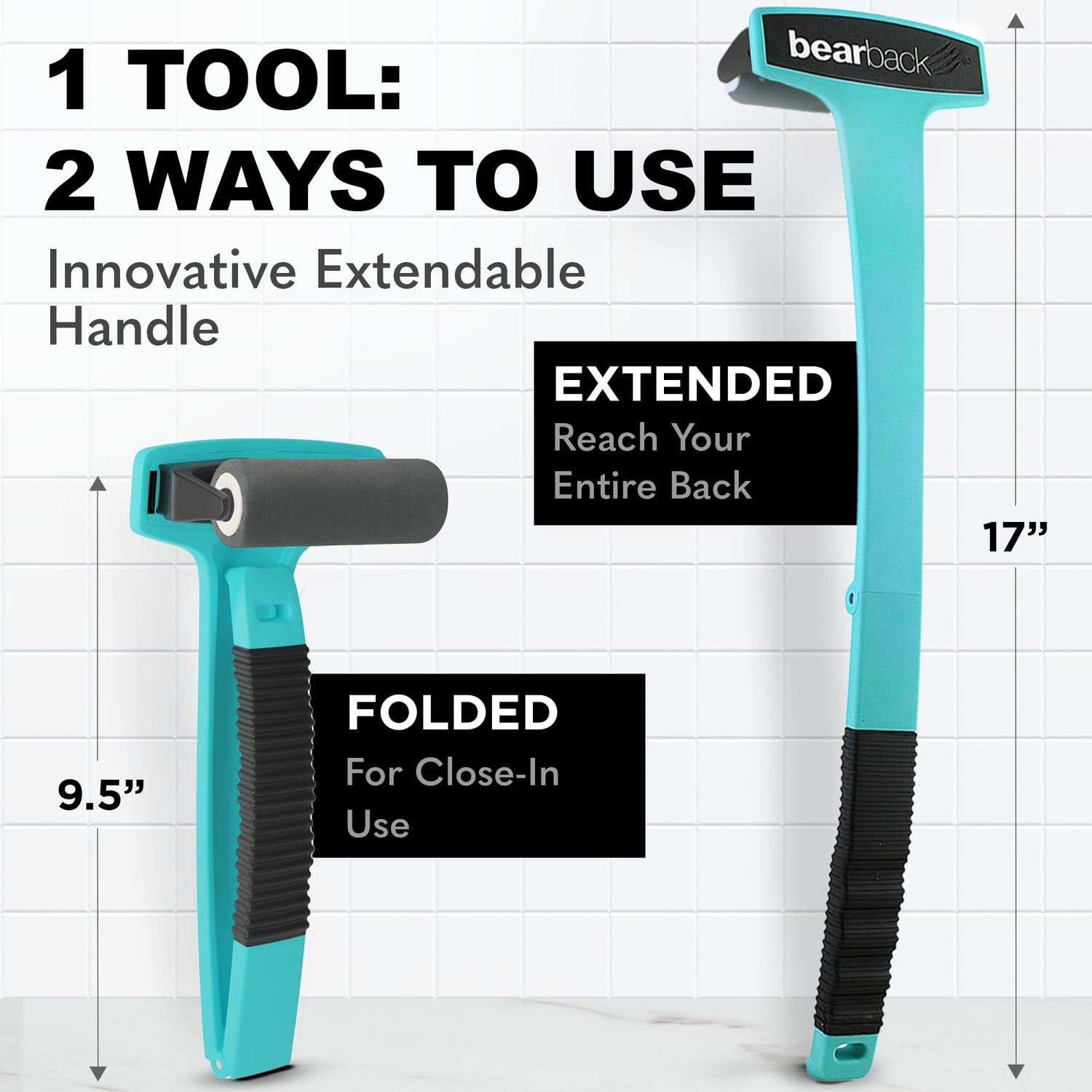 - FOLDABLE LONG HANDLE FOR TOTAL REACH - Our ergonomically curved handle folds in half for easy storage and extended reach. If you're like 99% of the population and can't reach your back, or just hate contortionist lotion routines—Bearback has your back (literally).