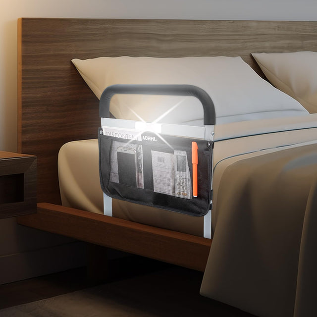 Bed Rails for Elderly Adults Safety with Adjustable Heights Storage Pocket Assist Support Side Railings Seniors Slides Under Mattressbed Cane Guard Bed Handles Bars (White (with Light))