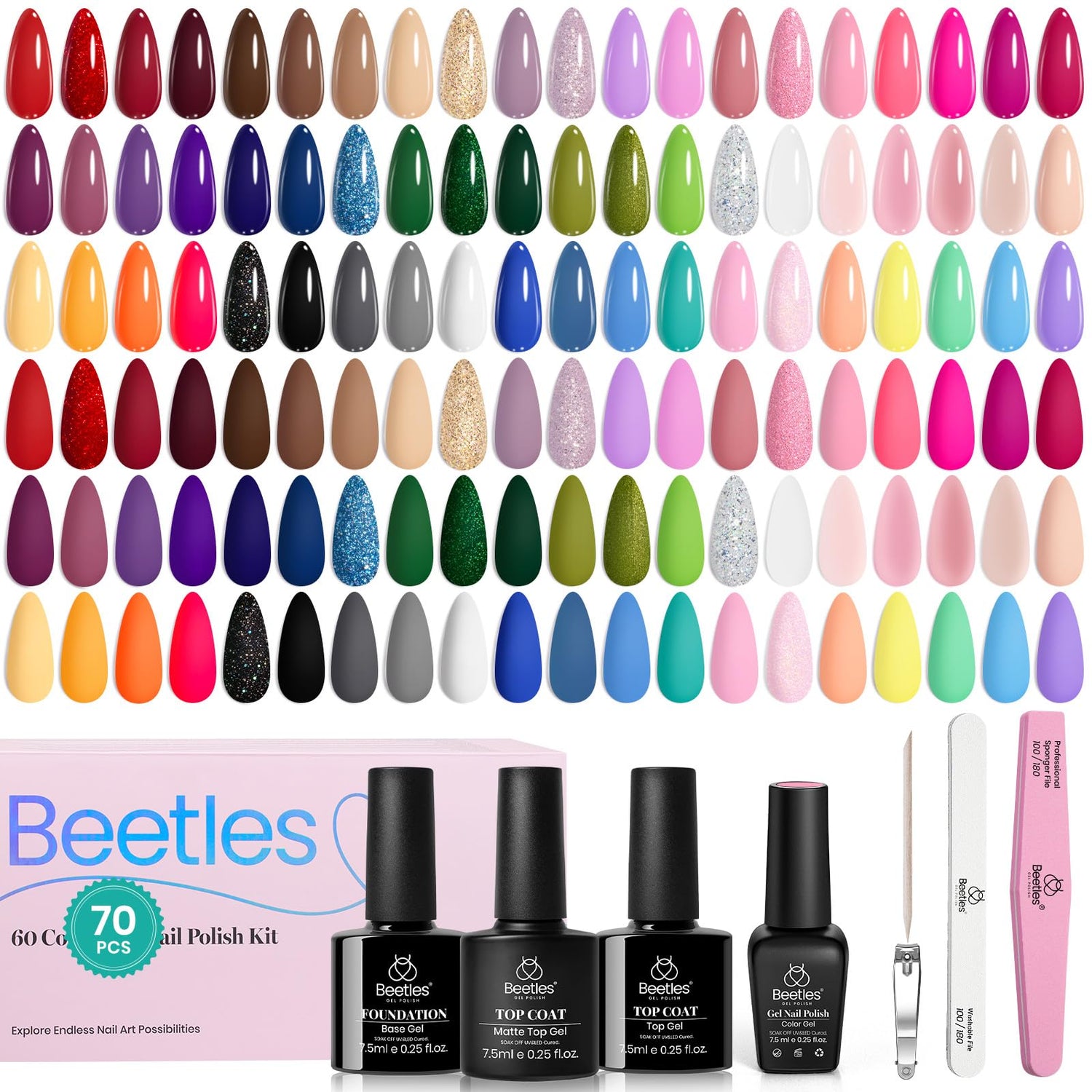 Beetles Winter Gel Nail Polish Set, 70 PCS 60 Colors Red Green Pink Brown Blue Nude Glitter Gel Nail Polish Kit with Base Top Coat for Beginners UV LED Needed DIY Salon Christmas Gifts for Women