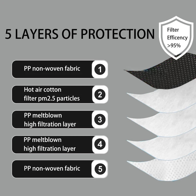 - FILTER MEDIA - This N95 Masks has four filter layers, PP spunbond outer layer, PP needle-punched nonwoven inner layer 19 g, PP meltblown high filtration layer, PP spunbond layer, PP meltblown high filtration layer have double layer thickening filter media.