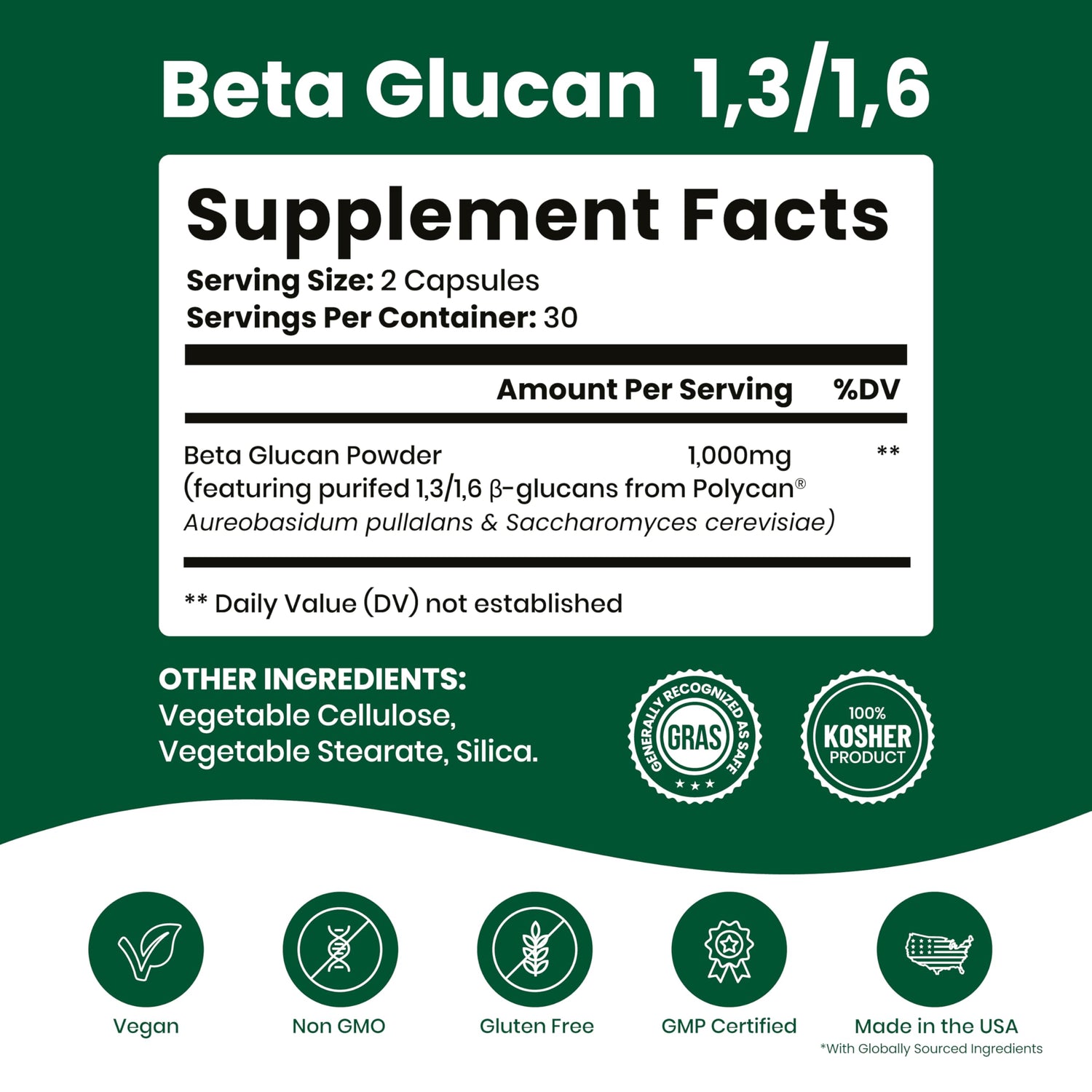Beta Glucan Supplements 1000mg – 1,3/1,6D Beta Glucan Capsules for Immune Support – Natural Beta Glucans Fiber Supplement – 60 Veggie Capsules (60 Count, Unflavored)