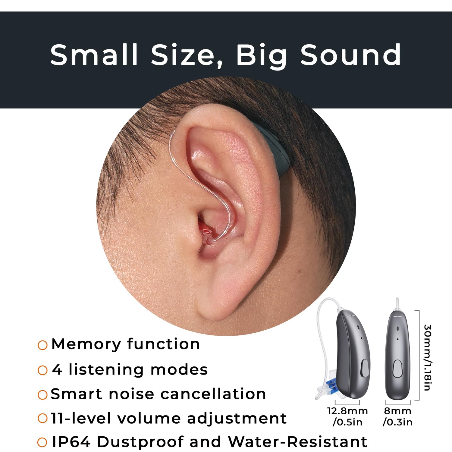 - Comfortable & Discreet Design – Engineered for effortless daily wear, these small behind-the-ear hearing aids feature an ultra-lightweight (3g only) ergonomic design that contours perfectly to your ear, barely visible to others. With balanced weight distribution and no pressure points, you'll forget you're wearing them - whether at work, social gatherings, or during exercise. Ideal for all-day use.