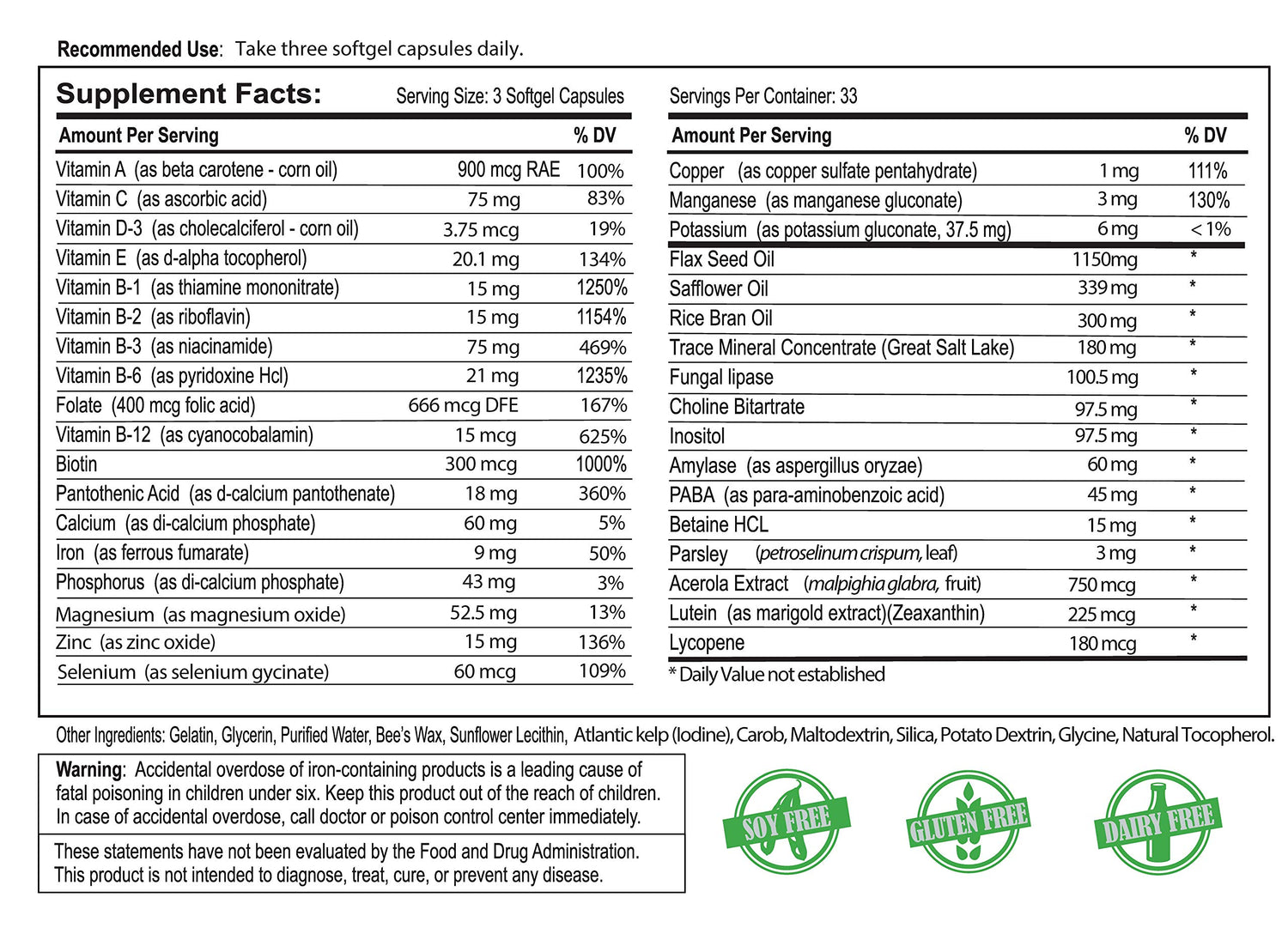 Details: Today many people are not able to or they choose not to eat a balanced diet of "wholesome" foods. As a result, the average American's diet is high in processed foods and many of the essential nutrients are taken out or changed due to the refining, processing (e.g., Hydrogenation, Oxidation) and filtering of those basic foods we eat. Bio-35 and it's 72 different ionically bonded trace minerals and elements will help fill in the gaps. To receive the best results from Bio35 take 1-2 capsules in the morning and 1 capsule in the evening. You don't have to take with food, but most people find they prefer to take with food. In 2-3 months you should start to notice a difference in how you feel. (We would like to share with you some of the benefits you should start to notice, but due to FDA regulations we can not list them. Read the reviews for both the possitive and neg from our customvers.) Store your Bio35 soft gels at room temp in a cupboard or counter top out of the sun. Do not refrigerate or keep in high humidity areas like a bathroom.