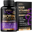 Biotin | Collagen | Keratin - Clinically Tested Supplement - Hair Growth Support, Skin & Nails - 25000 mcg Vitamins B2, B3, B6 & B7 + B1 & Hyaluronic Acid - Made in USA - Women & Men | 60 Capsules