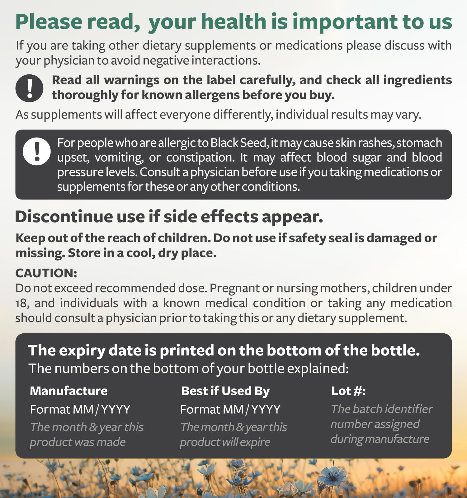 - Allergy Information: Black Seed Oil is derived from seeds, people with a known allergy to seeds should avoid taking black seed oil.