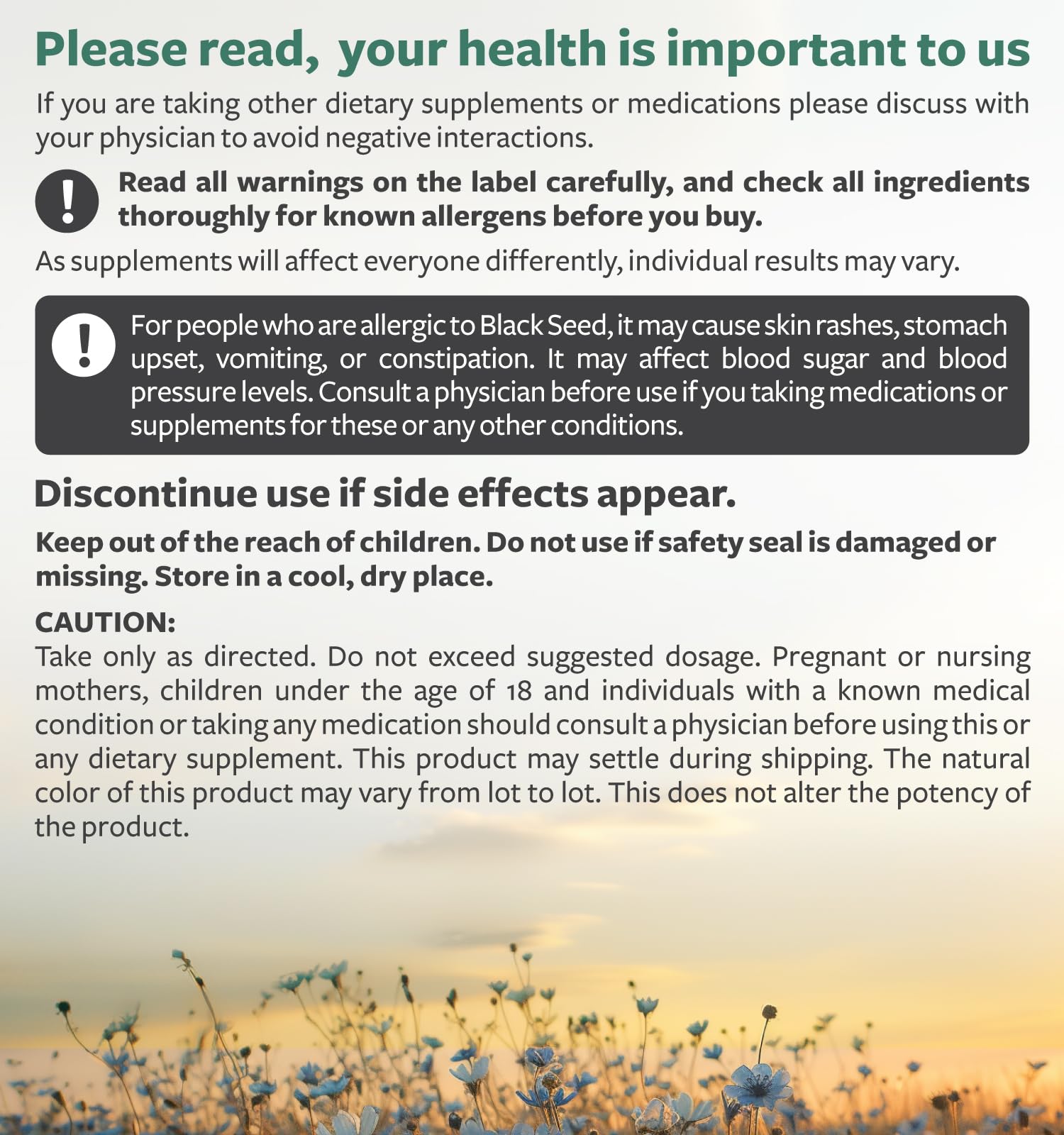 - Allergy Information: Black Seed Oil is derived from seeds, people with a known allergy to seeds should avoid taking black seed oil as it may cause an allergic reaction.