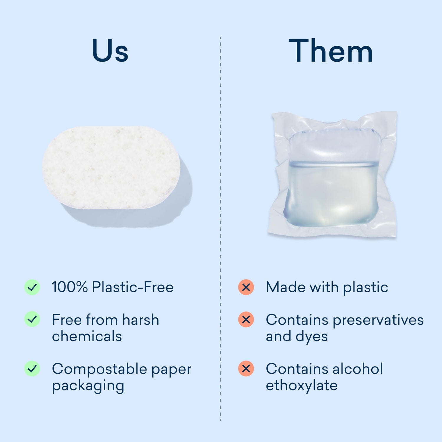 - PLASTIC-FREE, ECO FRIENDLY DISHWASHER DETERGENT TABLETS. Dishwasher Detergent Tablets that are tough on stains, but gentle on the planet. Our 100% plastic-free tablet is just as easy as any detergent pod, without any of the plastic film (PVA) found in most conventional pods.