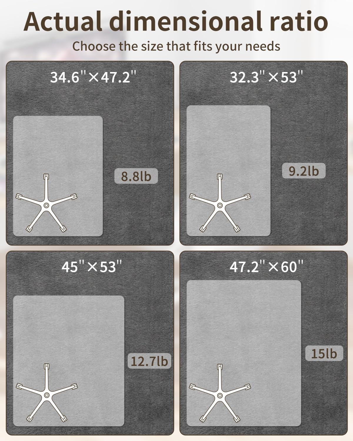 - Multi-functional Floor Mats: This desk floor mat is suitable for wood floors, tile floors, ceramic floors, short pile carpets and high pile carpets. It can be used as office chair mats, wood floor protectors, computer chair mats, table mats and pet mats.