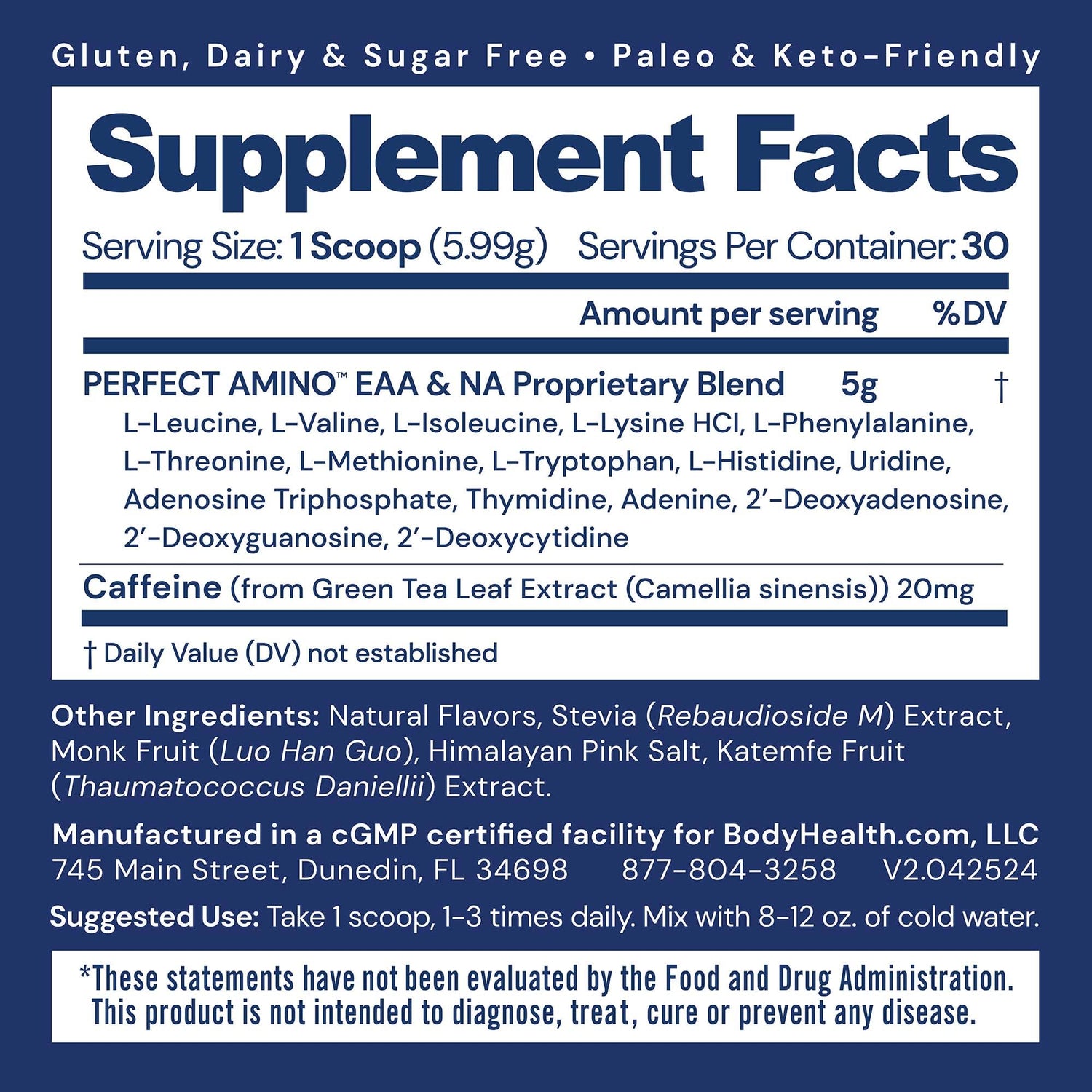 BodyHealth PerfectAmino Powder - BCAA and EAA Powder for Pre and Post Workout - Amino Acid Energy Drink for Men and Women to Support Lean Muscle and Recovery - Mocha - 30 Servings