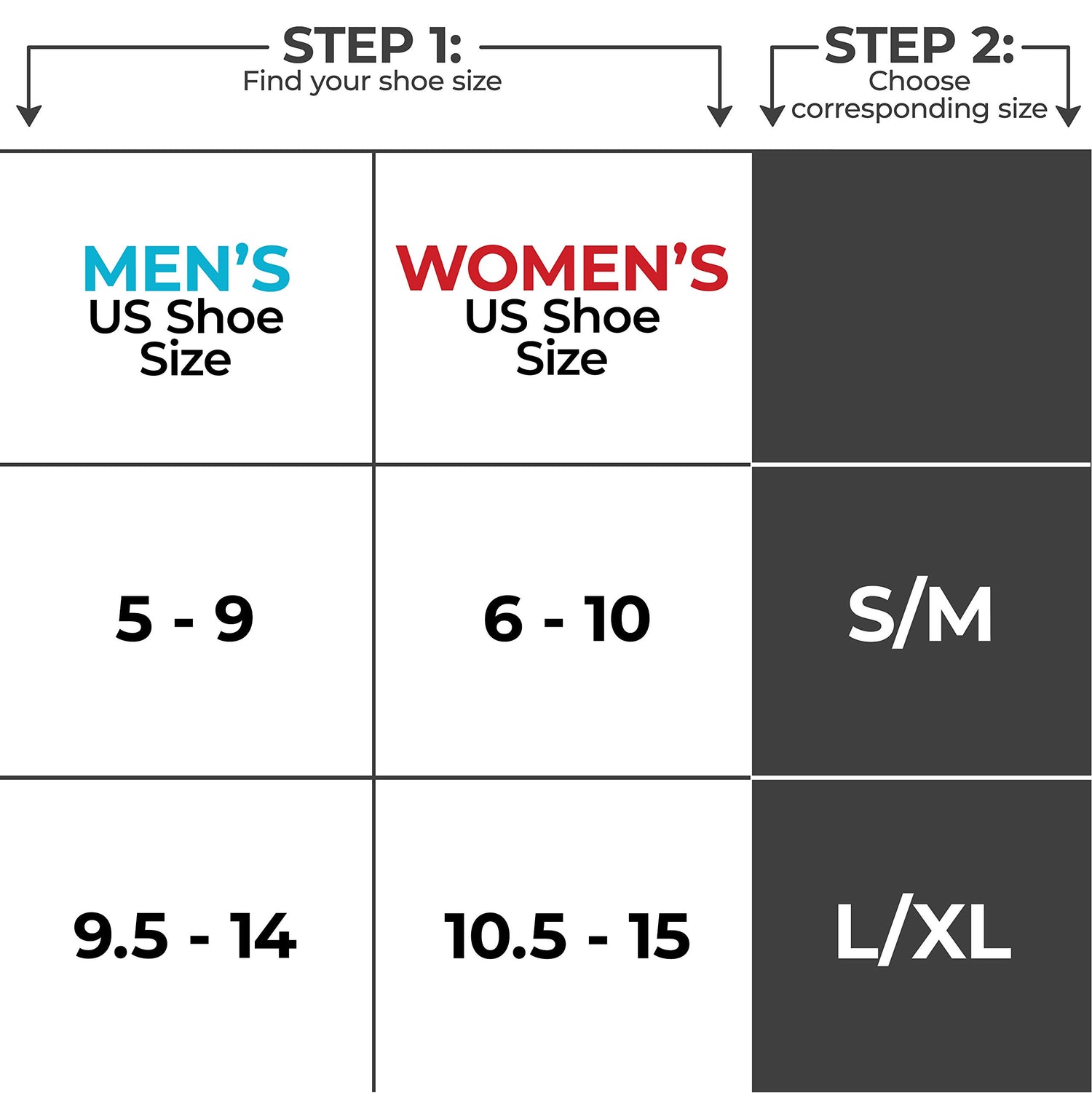 - BEFORE PURCHASING please view our size chart (the 2nd image above). Size S/M fits U.S. Men's shoe sizes 5-9 and U.S. Women's shoe sizes 6-10. Can be worn on your RIGHT OR LEFT FOOT, with or without a sock.