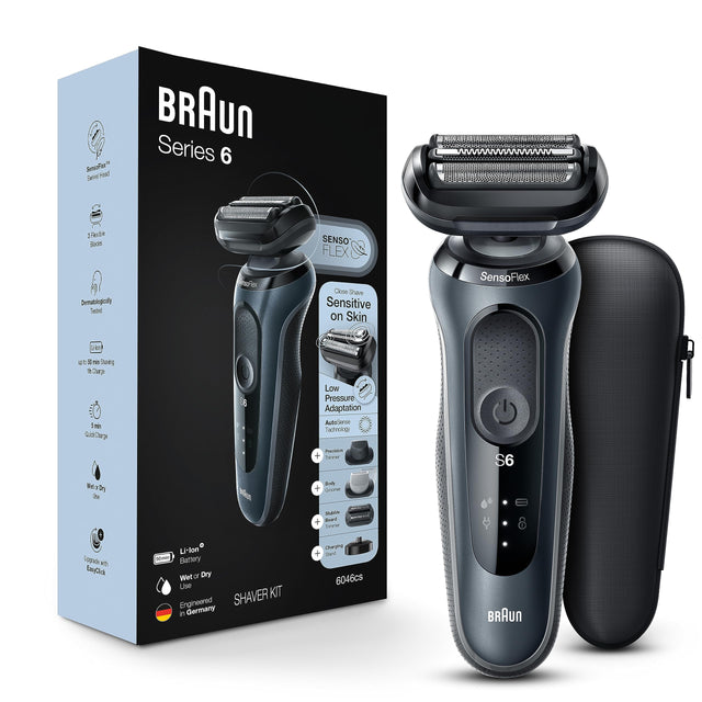 Details: Braun Series 6 electric shaver for men features a dermatologically tested SensoFlex swivel head and SensoFoil blades that enable low pressure adaptation for closeness, whilst remaining sensitive on your skin. The Li-Ion Battery provides up to 3 weeks of shaving and a 5 min quick charge. This men's electric razor is 100% waterproof for Wet & Dry use. Includes: 1x Series 6 Electric razor for men - Black 1x Body Groomer 1x Precision Trimmer attachment 1x Stubble Trimmer attachment 1x Travel case 1x Smart plug for automatic 100-240 voltage adjustment 1x Cleaning Brush