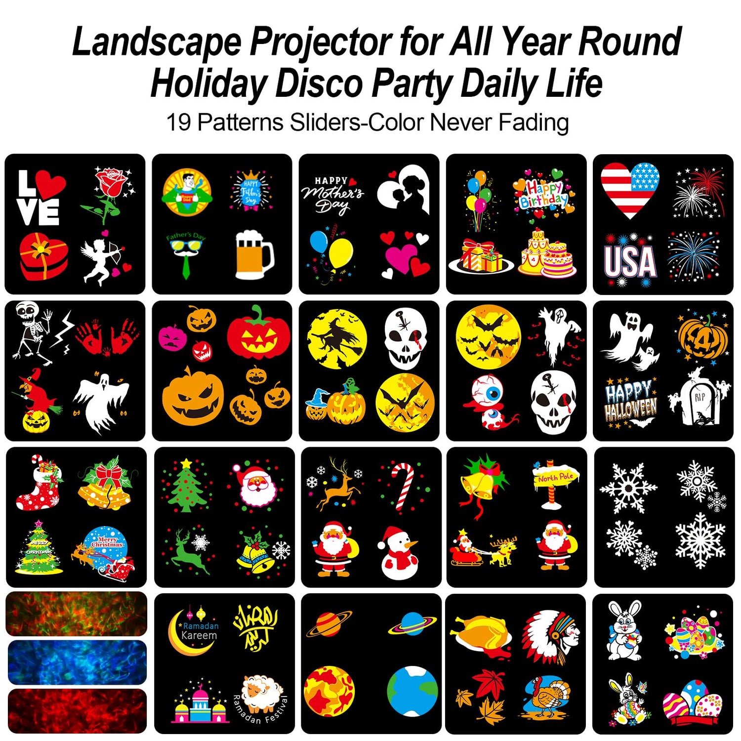 - 【19 Slides Can Be Used Throughout The Year】Accompanies 19 slides with a total of 76 patterns and 11 festival themes, which are:Halloween, Christmas, Birthday, Valentine's Day, Thanksgiving, Easter, Children's Day, Independence Day, Mother's Day, Father's Day and Eid Ramadan, there are five types of Halloween slideshows, enough for you to choose the most satisfactory pattern. Other themes are enough to apply to festivals large and small throughout the year.