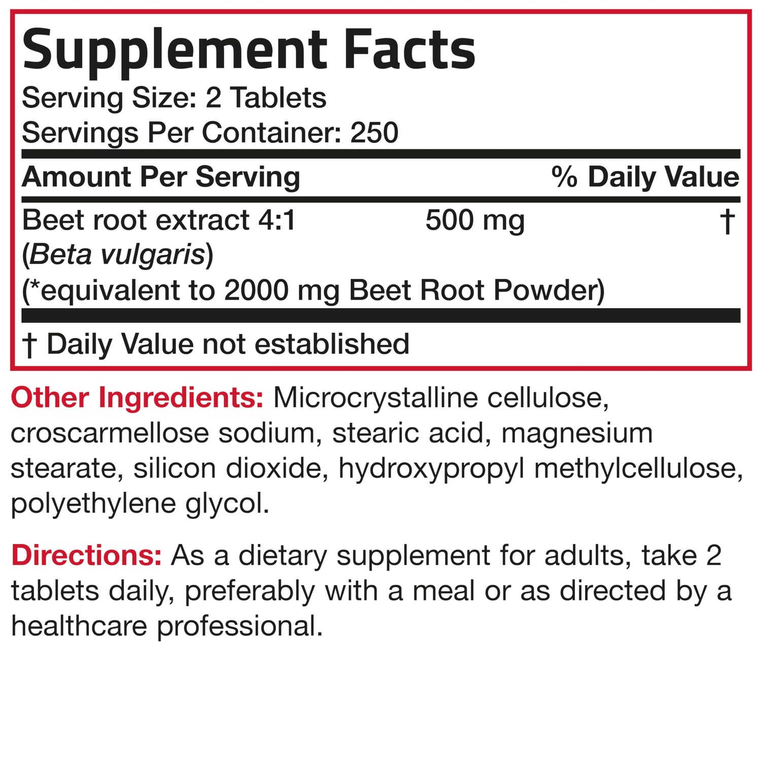 - Extra Strength Formula: Bronson Beet Root provides equivalent to 2000mg of beet root powder per serving (from 500mg 4:1 extract) to help the body maintain healthy circulation and overall stamina.* Beets naturally contain nitrates, which have been shown to support vascular function.