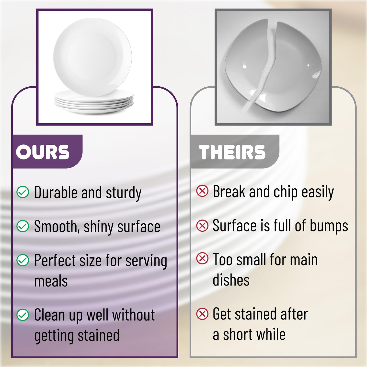 - Classic white design ensures these plates will complement any existing dinnerware or dining room theme, providing a clean, timeless look for any table setting.