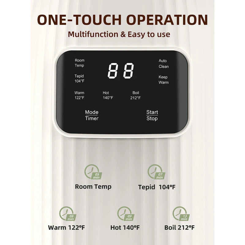 - 【Easy to Use & VERSATILE 】Automatic nut milk maker has 9 functions and can skip the soaking process, suitable for making various plant-based milk. The Room Temp is specially designed for almond and cold nut milk. Tepid(104℉), Warm (122℉), and Hot(140℉)are used for various hot drinks, and Boil(212℉)is used for making soy milk and rice milk. Moreover, it also features functions for 120s Auto clean, Sterilize, Keep warm, and Timer (up to 12 hours).