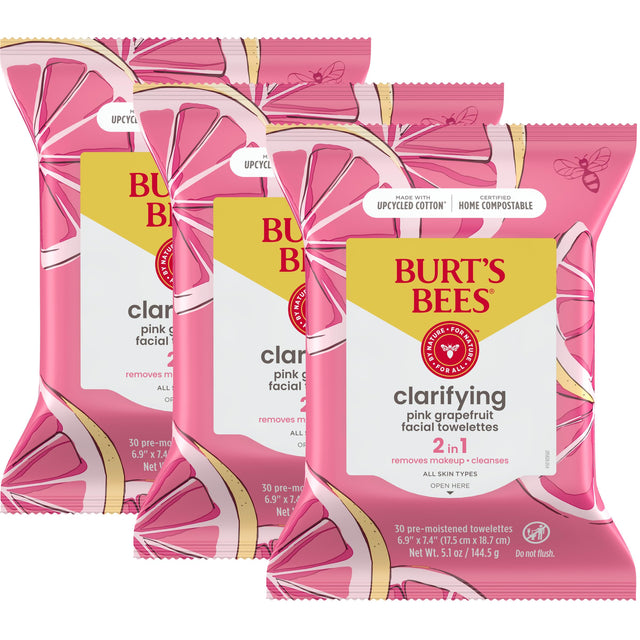 - NOURISHING INGREDIENTS: Three 30 ct. packages of Burt's Bees Clarifying Facial Towelettes With Pink Grapefruit
