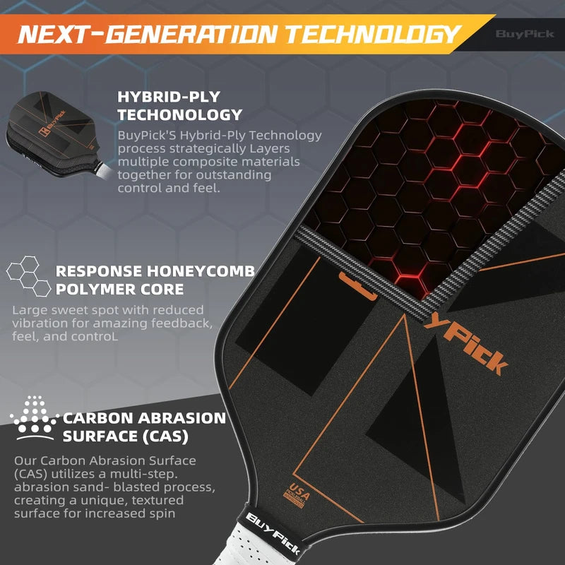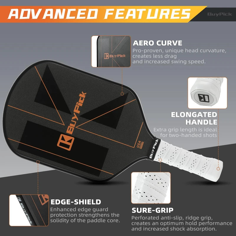 - 【High strength Carbon Fiber Surface】 BuyPick pickleball paddles made of exceptionally durable high-strength carbon fiber composite materials, compared to ordinary graphite surfaces and glass fibers, the texture on the surface of high-strength carbon fibers can generate small friction when in contact with the racket ball, providing huge energy for rotation.