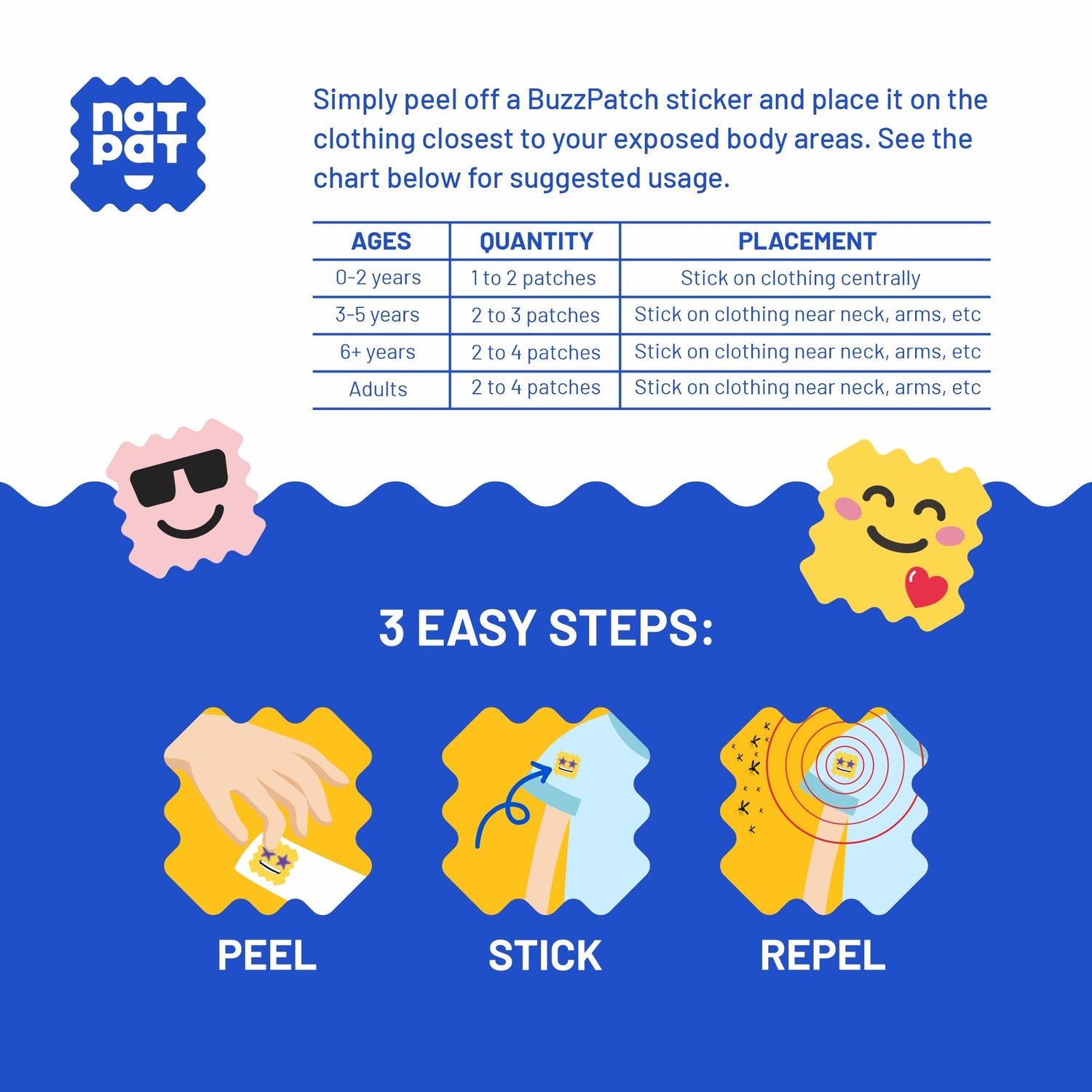 - SAFE AND EFFECTIVE: Created with you and your kids in mind. This mosquito sticker is made with all natural, plant-based ingredients. BuzzPatch is non-toxic and DEET free and uses the most effective and safe essential oil combination.