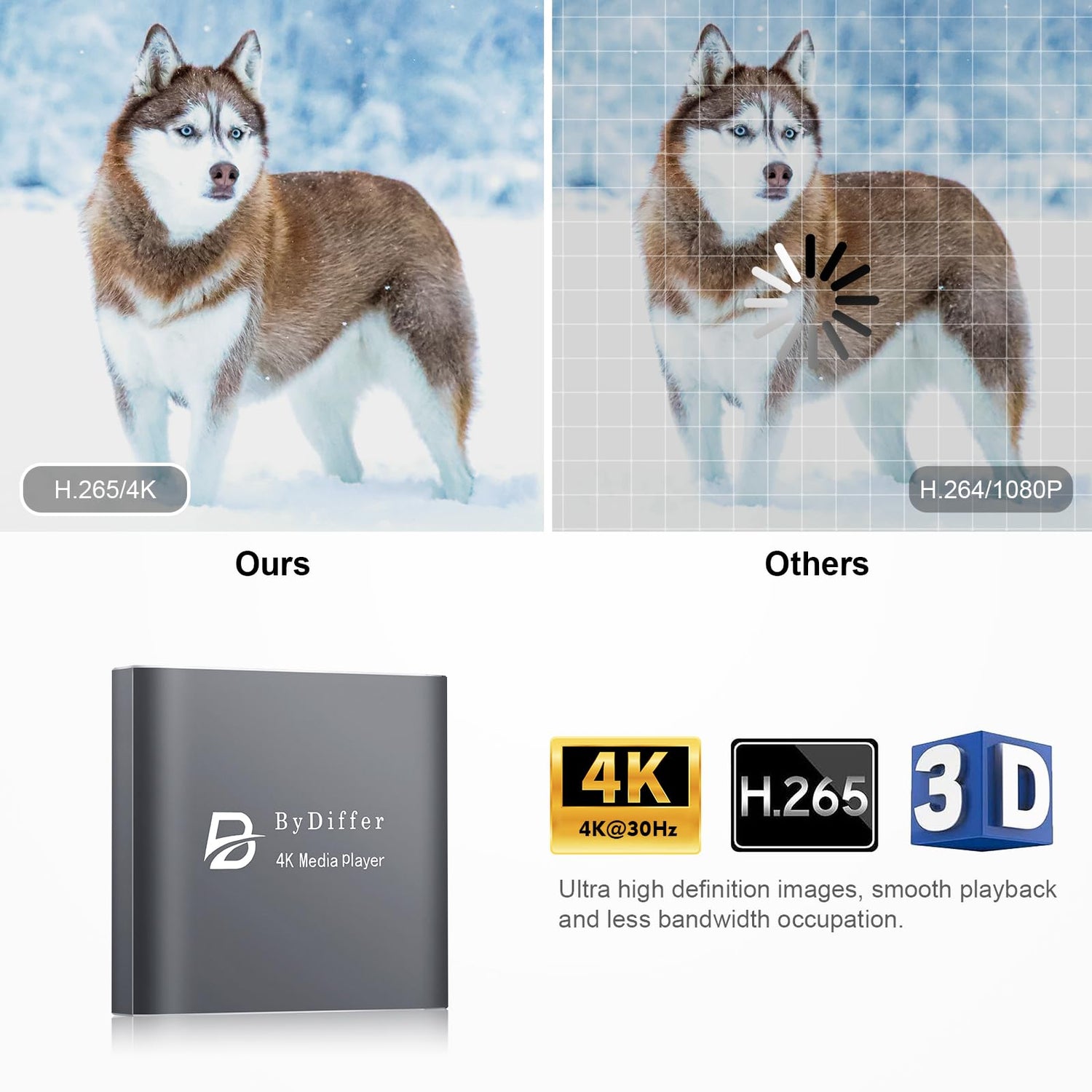 - 【Powerful H.265 Decoding】USB video player supports H.265/HEVC decoding technology up to 4K@30Hz resolution and 200mbps. Compared with H.264 decoding and 1080P resolution, ByDiffer hdmi 4K media player for TV has ultra high definition images, smooth playback with less buffering and less bandwidth occupation.