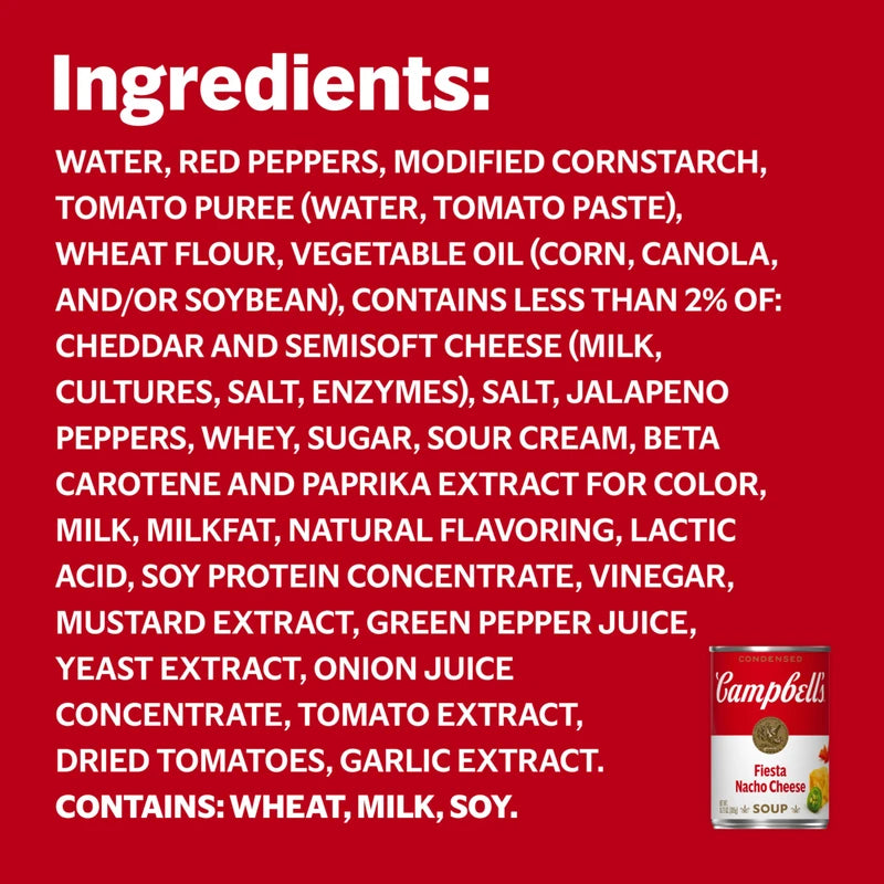 - HIGH-QUALITY INGREDIENTS: Fiesta Nacho Cheese Soup starts with spicy peppers and rich cheddar cheese for a deliciously smooth and spicy flavor
