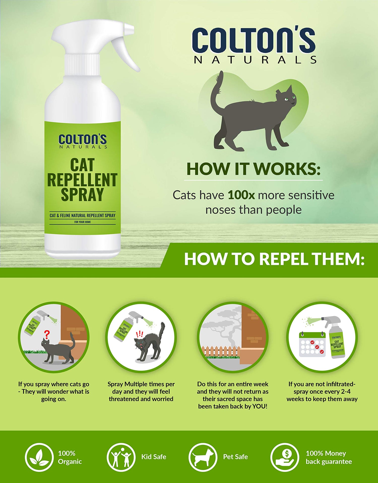 - Natural deterrent changes cats behavior around your property; as soon as cats find shelter or a food source they can exploit on your property, it becomes a target; spraying this natural repellent, cats will wonder what happened to their coveted trash area or new home under your deck or crawl space and attics; Spray consistently and over the next 2 to 5 visits and the cats invading your space will change their behavior and move on