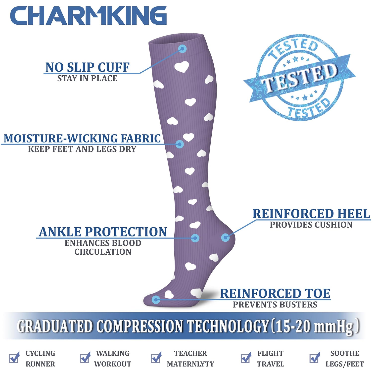- COMFORTABLE MATERIAL AND CAREFUL CONSTRUCTION - CHARMKING knee high compression socks' material are upgraded with nylon percentage from 40% to 85%, Delivers 360-degree stretch for greater flexibility and durability. Breathable high performance fabric keeps an optimal temperature. We are confident that you will choose it!