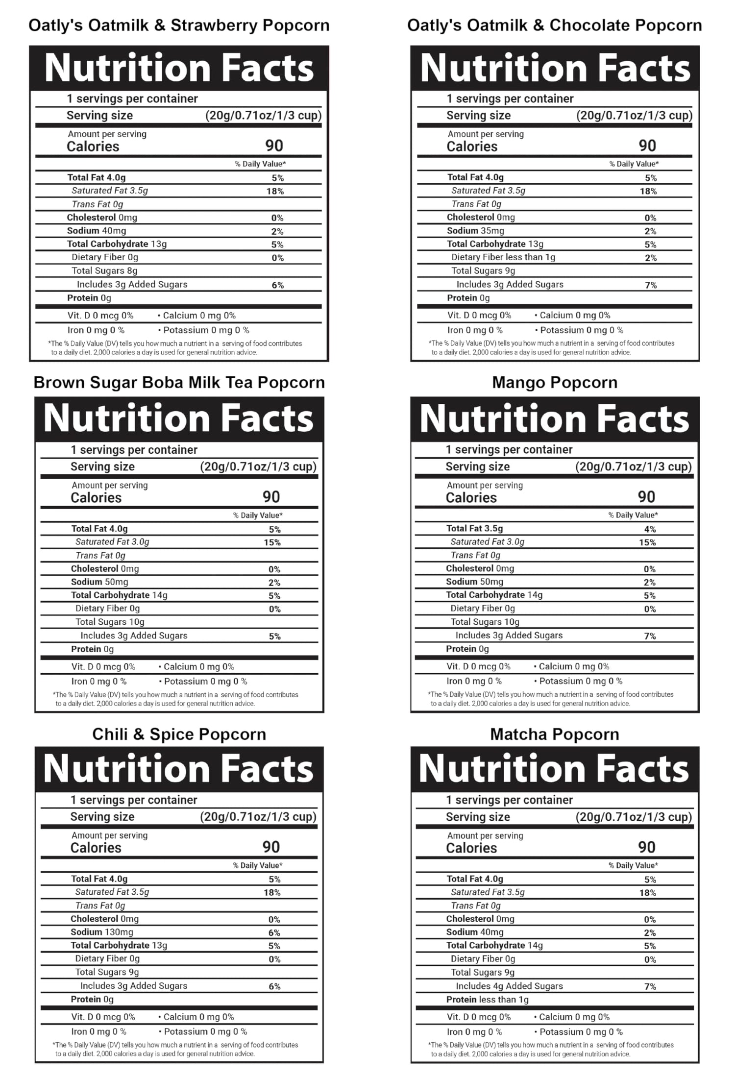 Details: Chef Poppin Gourmet Popcorn Variety Pack – A Perfect Blend of Sweet, Spicy, and Creamy Flavors. Take your snacking to the next level with Chef Poppin’s Gourmet Popcorn Variety Pack, featuring six exciting and unique flavors: Matcha, Brown Sugar Boba Tea, Mango, Chili & Spice, Oatly’s Oatmilk & Chocolate, and Oatly’s Oatmilk & Strawberry. This carefully curated selection brings together a mix of earthy, fruity, creamy, and spicy flavors, making every bite a delightful surprise. Crafted with non-GMO kernels, an oil-free air-popping process, and no preservatives, this popcorn delivers a light and crispy texture while maintaining the rich flavors of its premium ingredients. From the smooth, earthy notes of Japanese matcha and the caramelized sweetness of boba tea to the tropical burst of mango and the fiery kick of chili spice, this variety pack offers something for every palate. Our innovative sugar-coating technology ensures that each kernel is perfectly coated for maximum flavor and crunch. Whether you're looking for a unique snack to share, an exciting gift for a foodie, or a delicious treat for yourself, Chef Poppin’s Variety Pack is the ultimate way to explore bold, gourmet flavors in one convenient collection. Try it today and experience the perfect fusion of taste and texture!