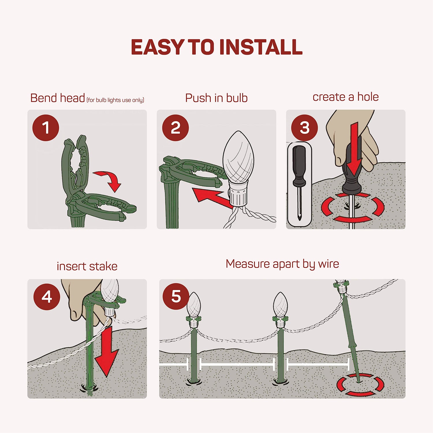 - UNIVERSAL USE: Our light clips can accommodate any string lights you own; Simply position the stake top to a flat position and wait for click sound then clip on the lights at the bottom of the bulb - For or rope lights let the stakes top way up ready to install.