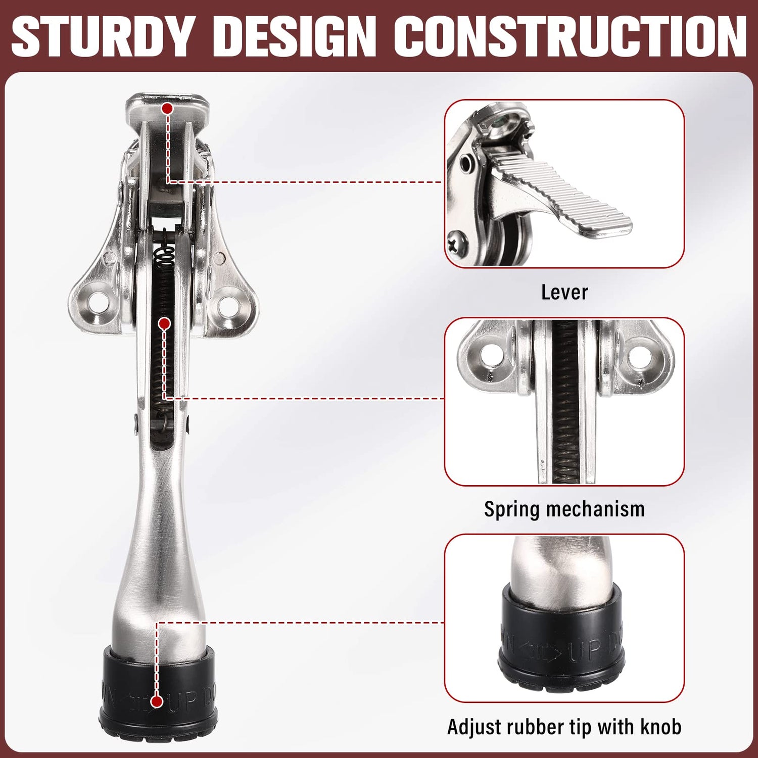 - Rubber Tip: our door stops for bottom of door has a rubber tip with adjustable height and a non slip 3 dimensional curved structure; The easy step doorstop will firmly grasp the floor tightly that touches the floor to reduce noise to avoid damage to the wall